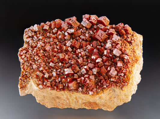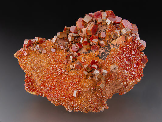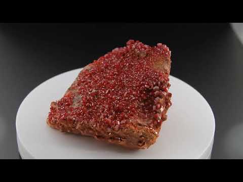 Vanadinite is a striking mineral with the chemical formula Pb₅(VO₄)₃Cl, renowned for its brilliant red to orange-red hexagonal crystals. This secondary mineral forms in the oxidized zones of lead deposits through the weathering and alteration of primary lead-bearing sulfide minerals such as galena. The formation process occurs when vanadium-rich groundwater interacts with lead minerals in arid to semi-arid environments, typically at relatively low temperatures near the Earth's surface. Vanadinite crystallizes in the hexagonal crystal system, often developing as short prismatic crystals with well-formed faces. Notable localities for high-quality vanadinite specimens include Morocco (particularly the Mibladen and Taouz regions), Arizona (Tucson Mountains), and Mexico (Sierra de Los Lamentos), where it forms in association with other secondary minerals such as wulfenite, cerussite, and pyromorphite in oxidized lead-zinc deposits.