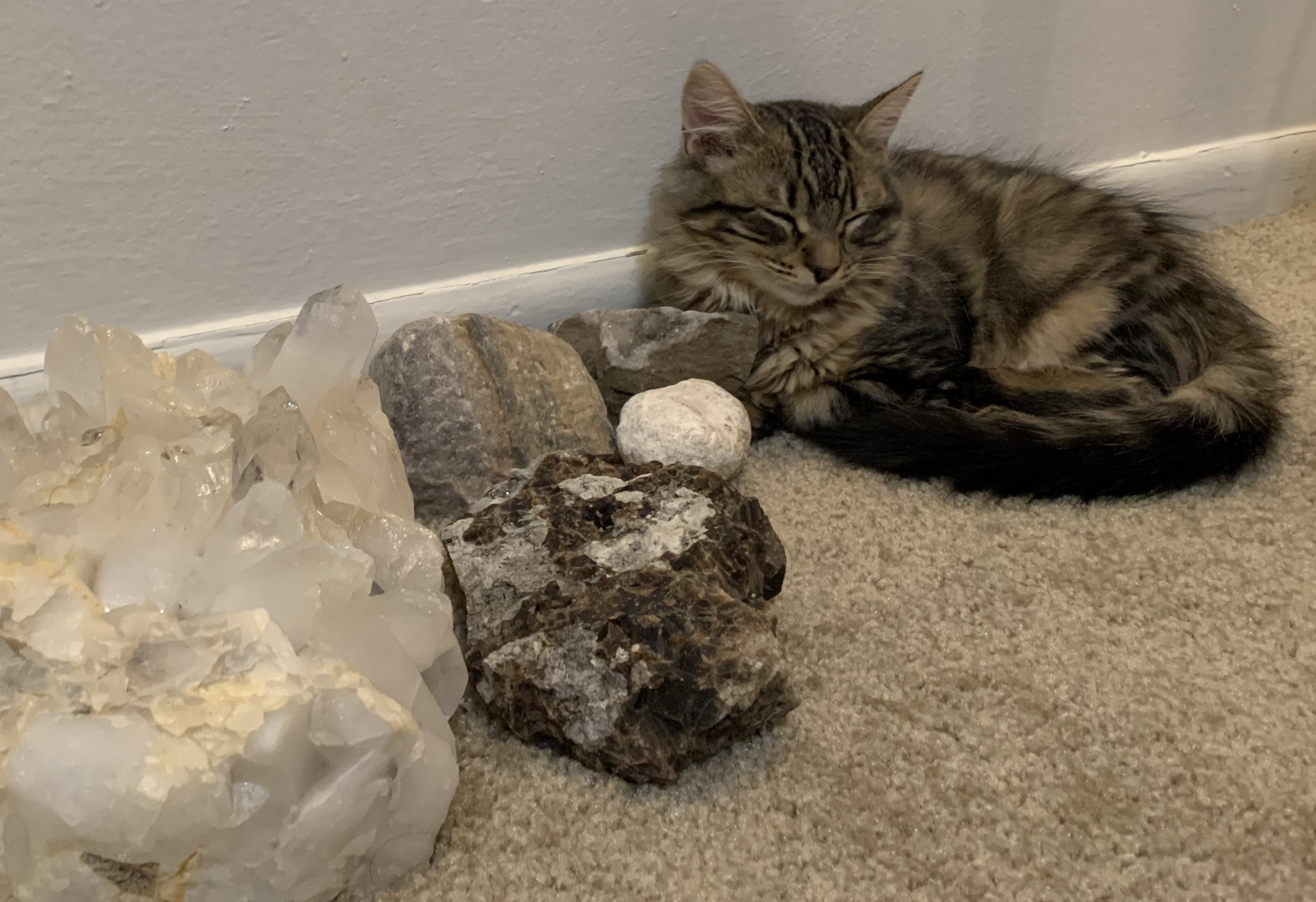 Our cat, Mochi, sleeping next to a pile of crystals!