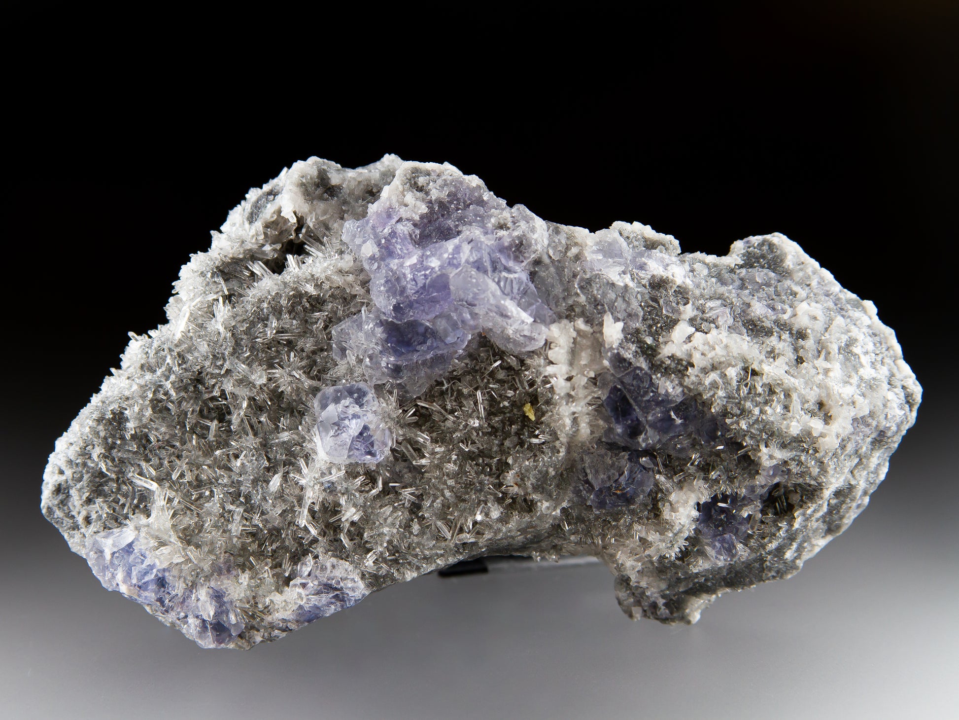 Blue fluorite crystals with octahedral shape surrounded by clear needle quartz. A great, eye-catching specimen with lots of sparkle and aesthetically pleasing contrast. 167.65 grams.