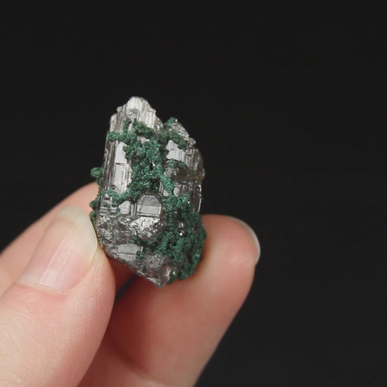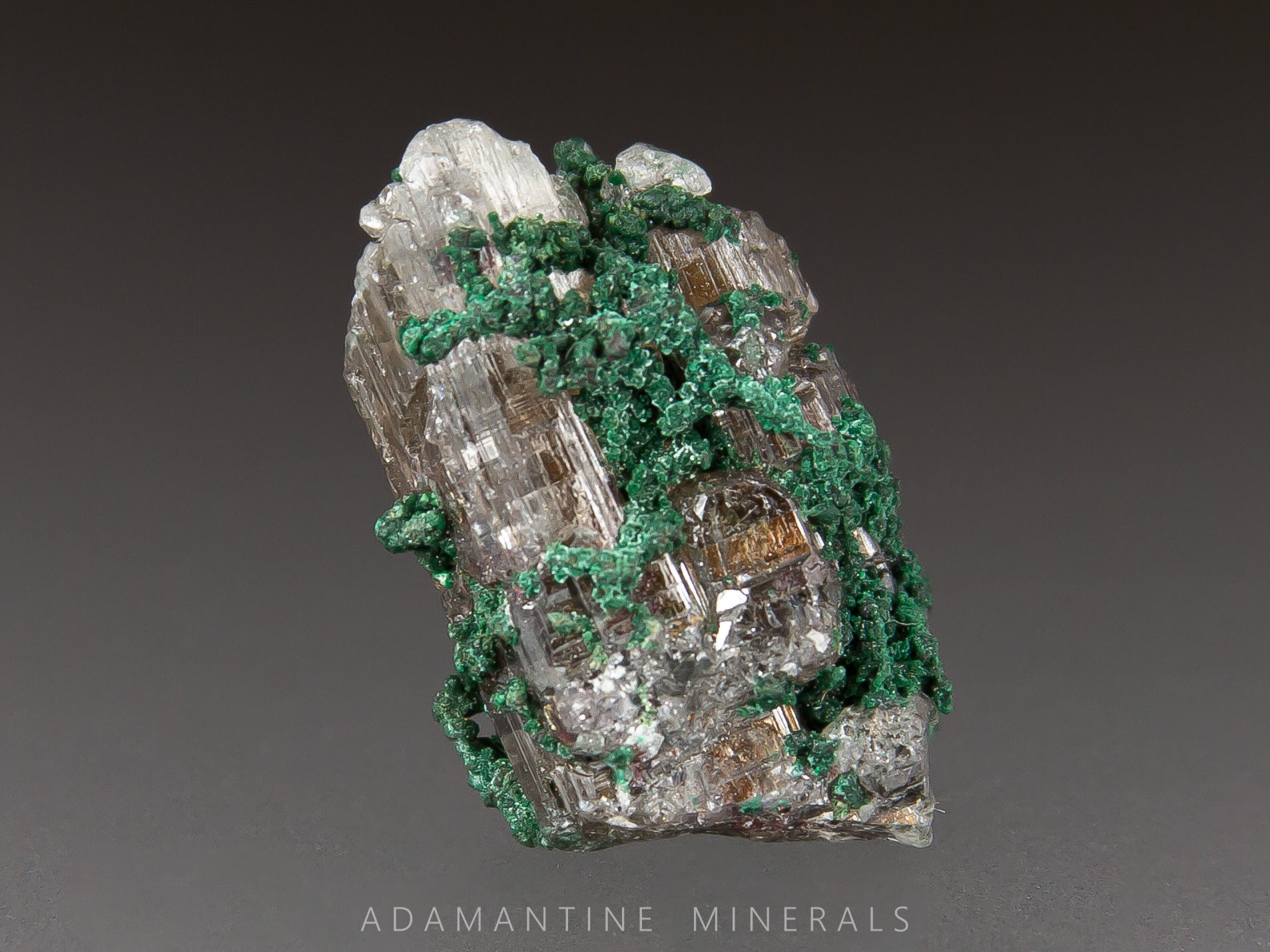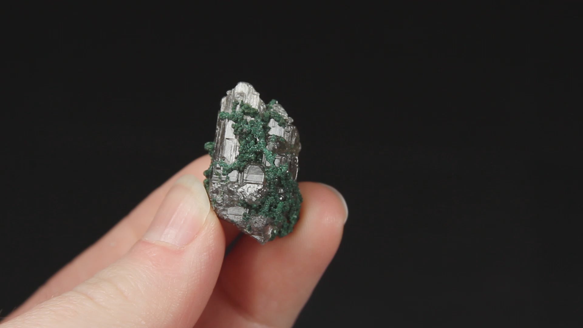A sharp and lustrous cerussite crystal with excellent enlongated form, adorned with bright green malachite. The cerussite shows well-developed, glassy faces and distinct striations, while the contrasting malachite wraps along the crystal edges and faces. This striking combination highlights the best qualities of both species and makes for a visually compelling and well-balanced specimen. A very sculptural Tsumeb piece!