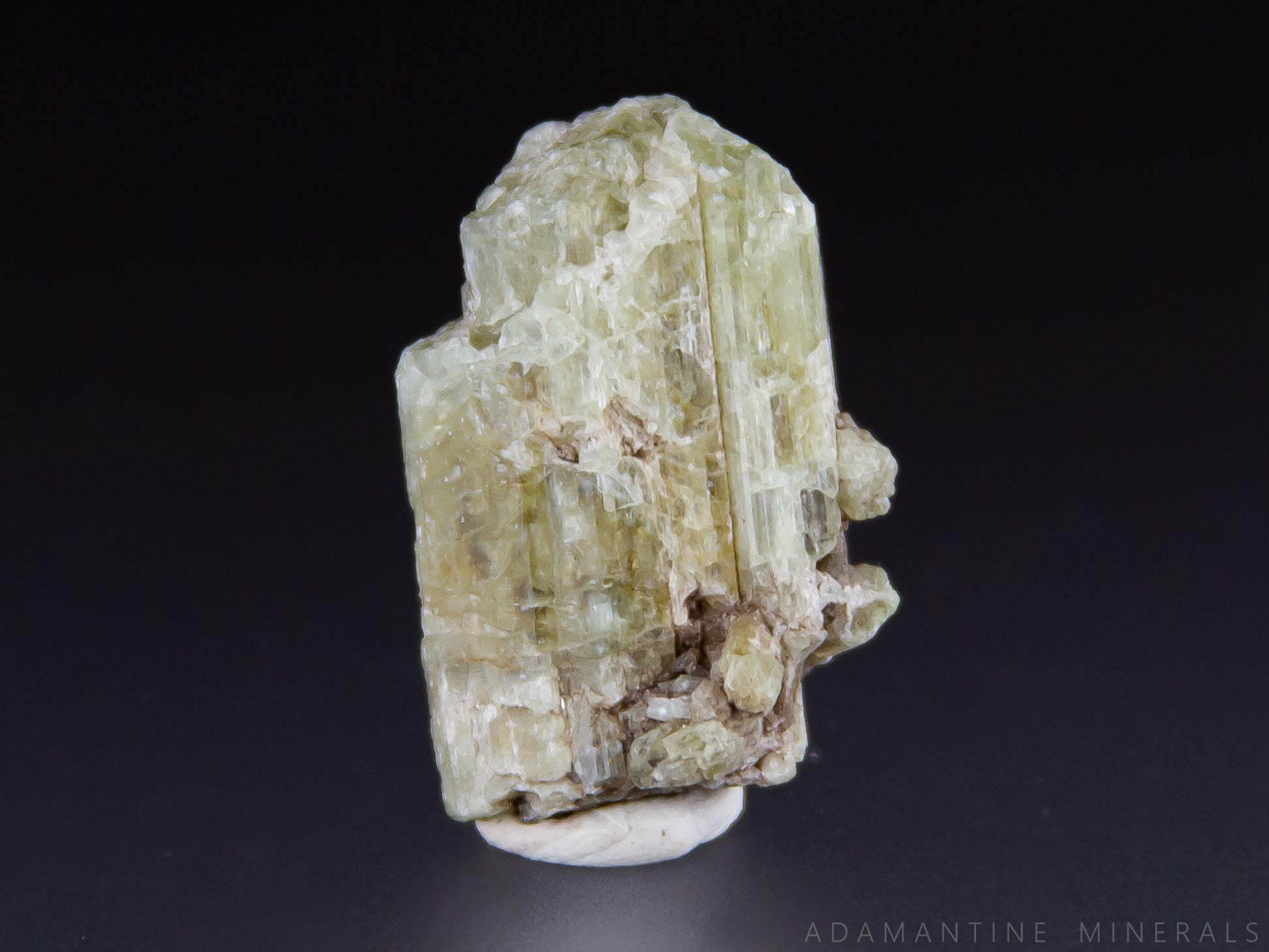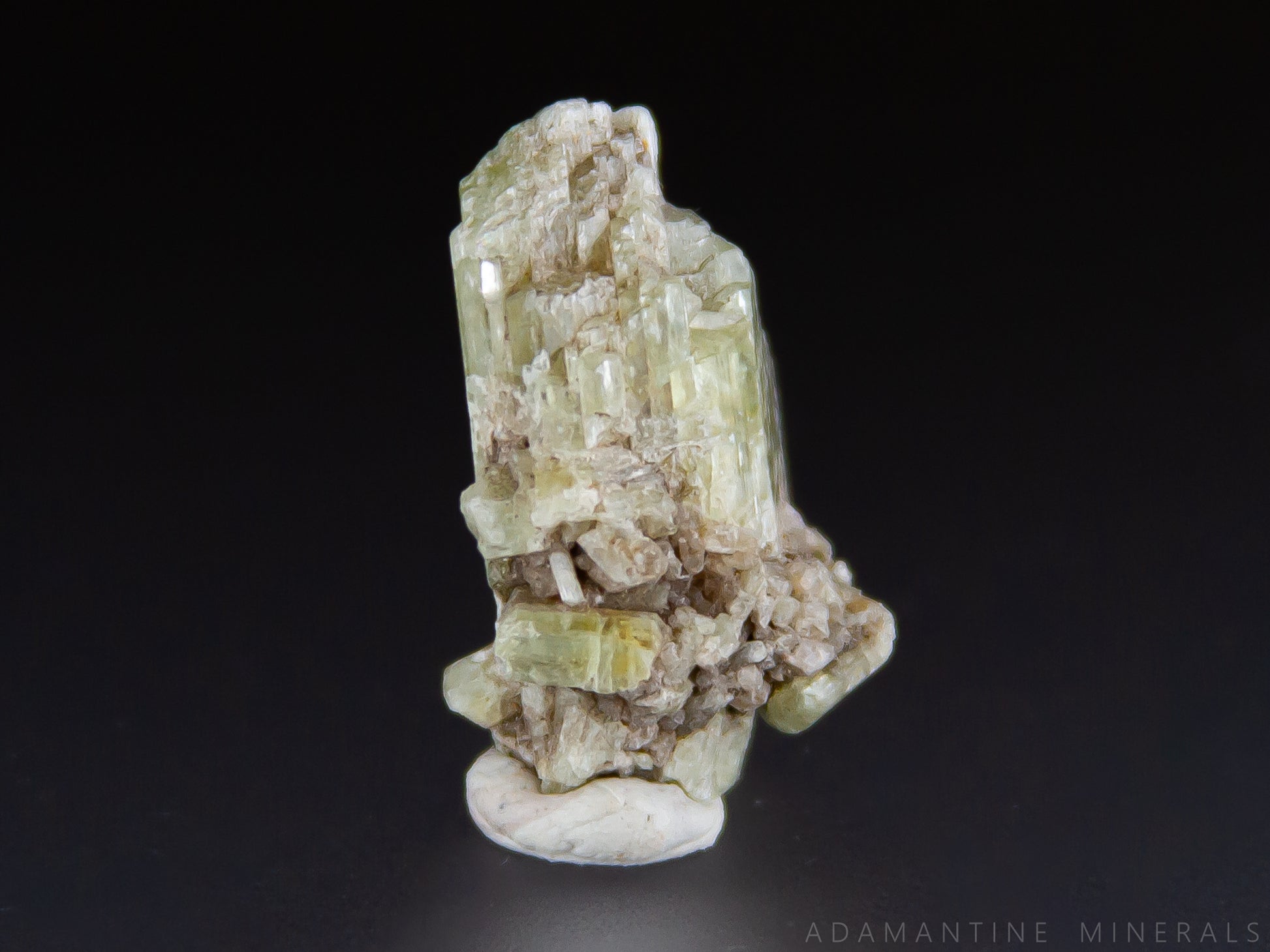 A blocky tremolite crystal from the Bancroft area, featuring stepped terminations and vertical striations along the prism faces. It has a lovely pale-greenish color, with smaller rider crystals closer to the base. A nicely composed thumbnail from a well-known Canadian locality, offering good representation of a prismatic tremolite crystal.