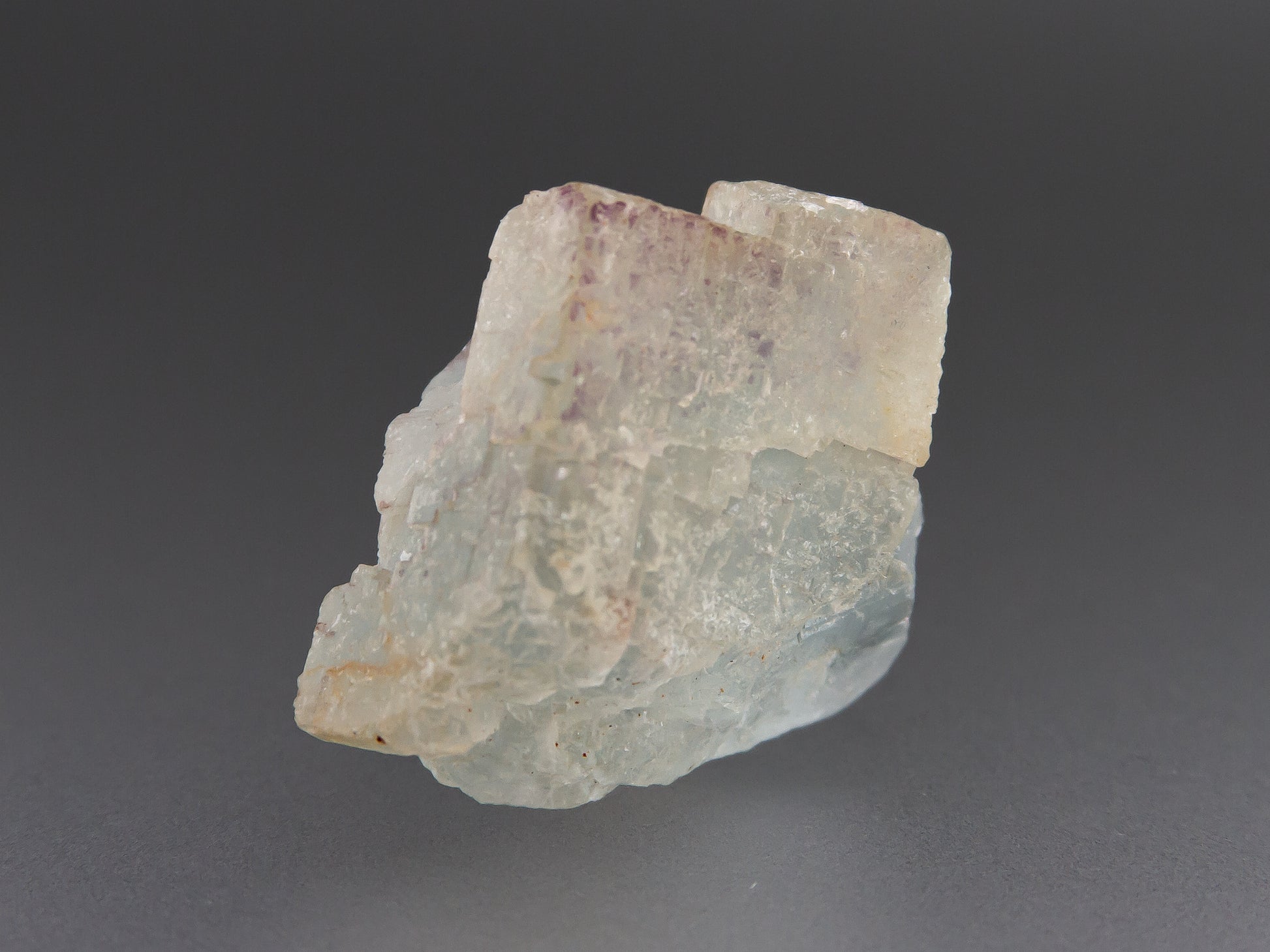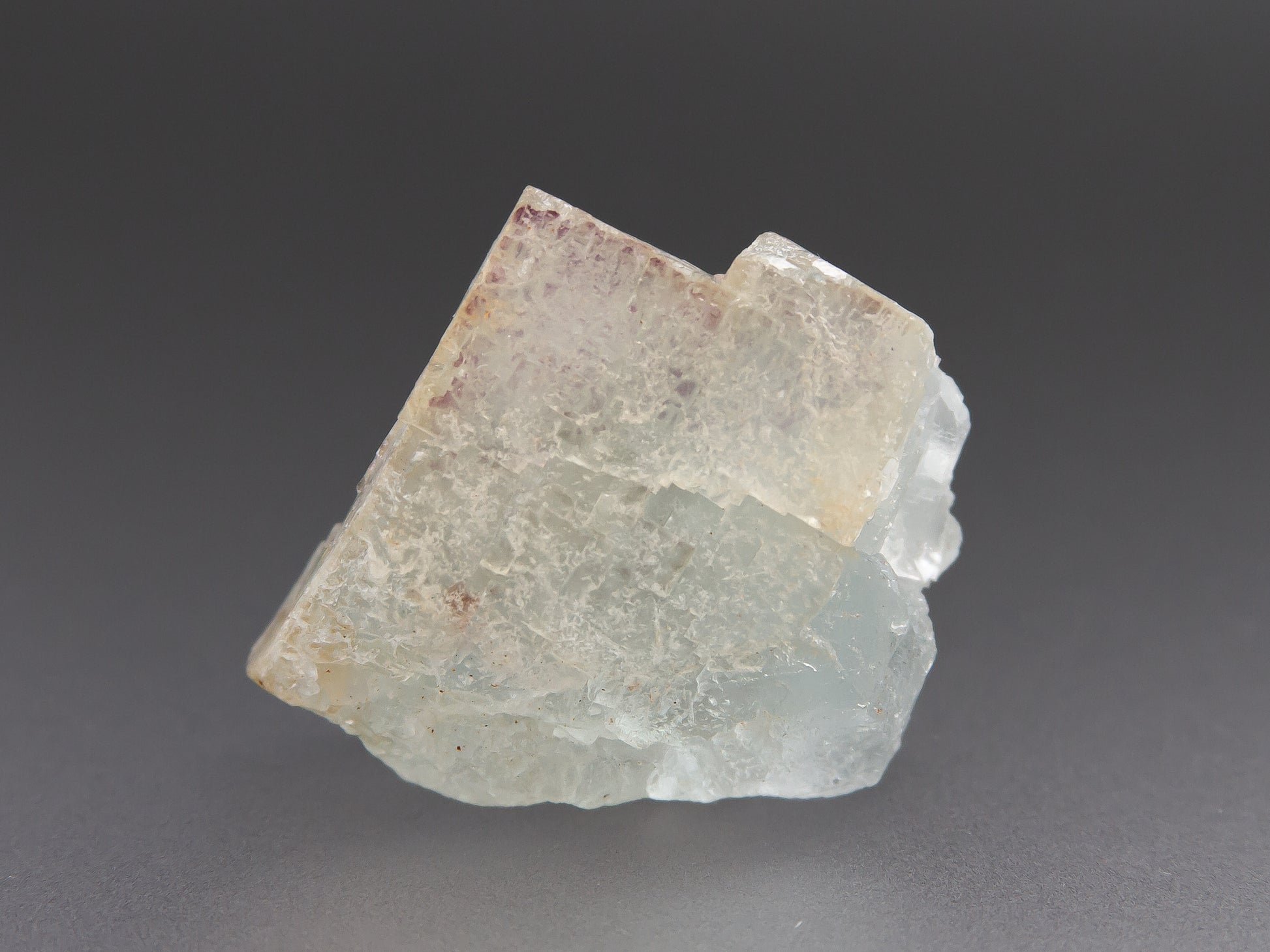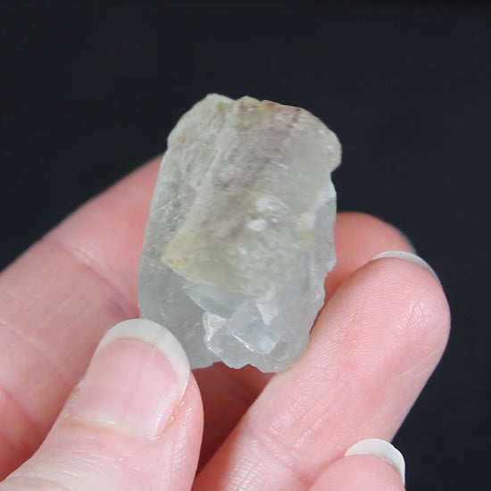 A translucent fluorite crystal showing a pale mix of colors with soft zoning from purple at the edges into blue-green and nearly colorless zones. The surface displays natural etching and frosted textures. This specimen is from Aouli, Morocco, a locality known for it lovely fluorites and fantastic mineral specimens.