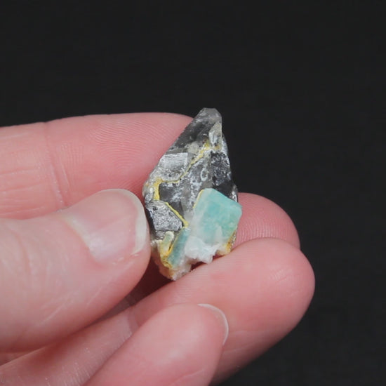 A lovely little specimen of the famous Coloradan mineral pairing; smoky quartz with amazonite. Known for their appealing color contrast and blocky crystal forms, specimens of these minerals are a North American classic. This specimen features a frosty smoky quartz with etched faces and a small amazonite crystal perched at the base. Though the amazonite crystal is not fully intact, its vibrant color is eye catching.