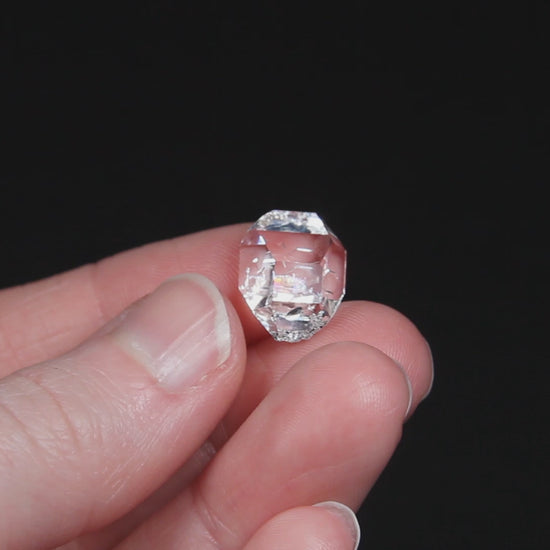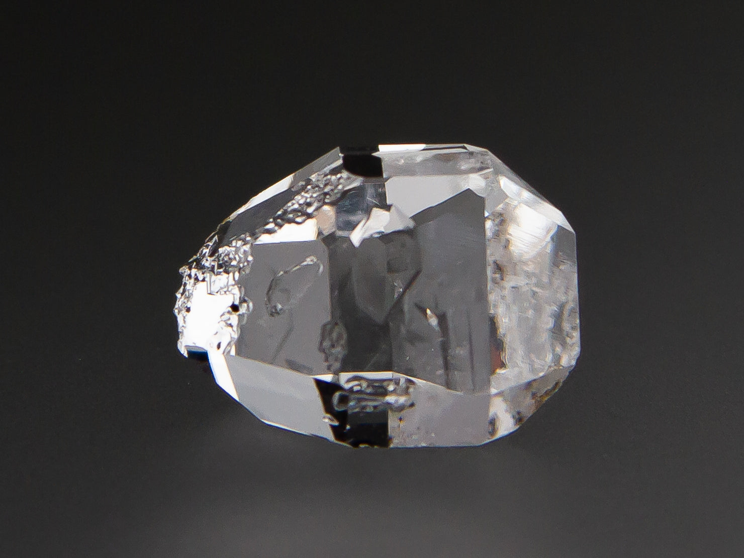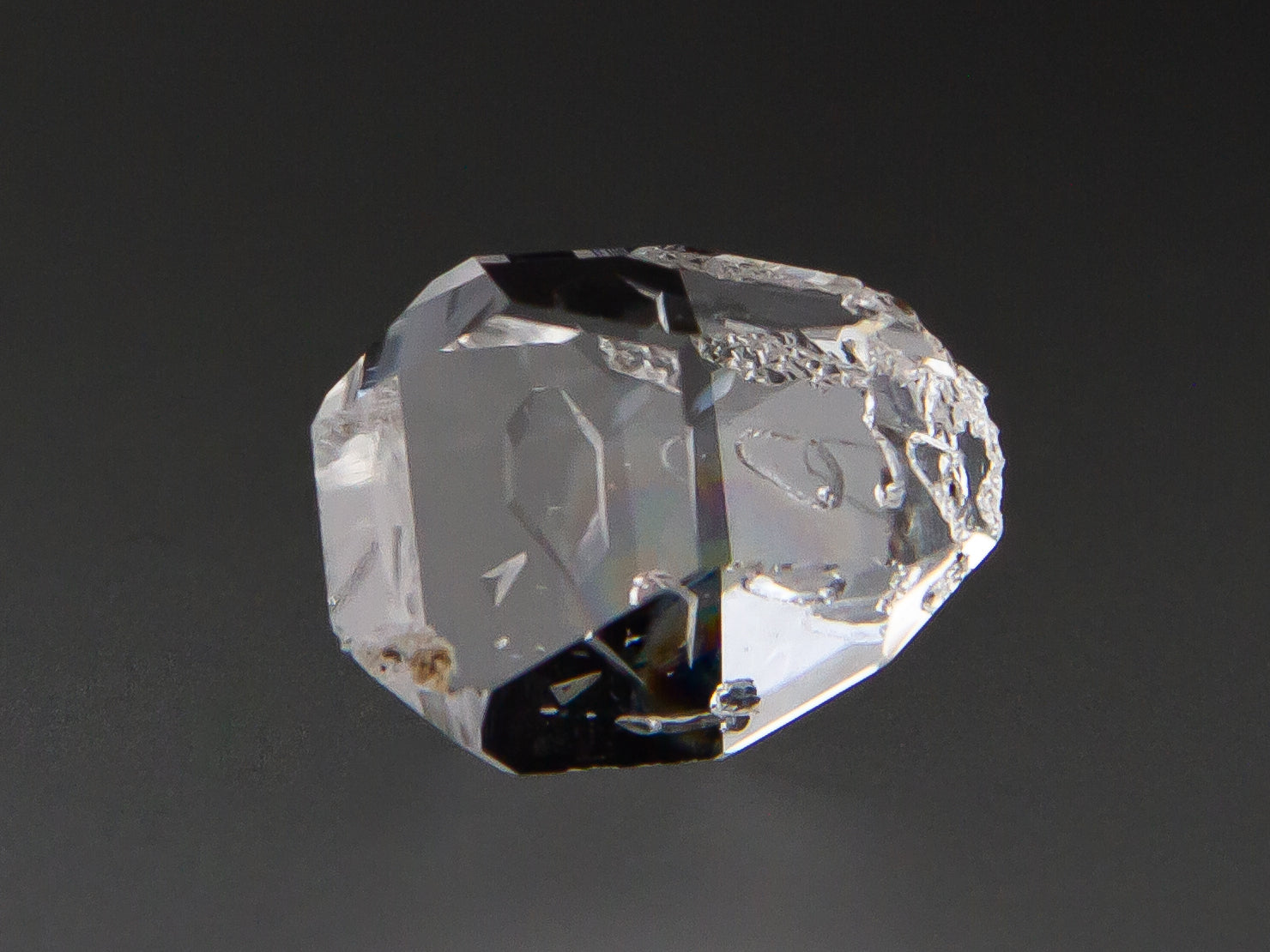 Water-clear Herkimer Diamond with double terminations and excellent glassy luster. This crystal features a more tabular shape, with contact indents showing where it grew in contact with the host rock, and geometric "footprints" left behind by neighboring crystals.