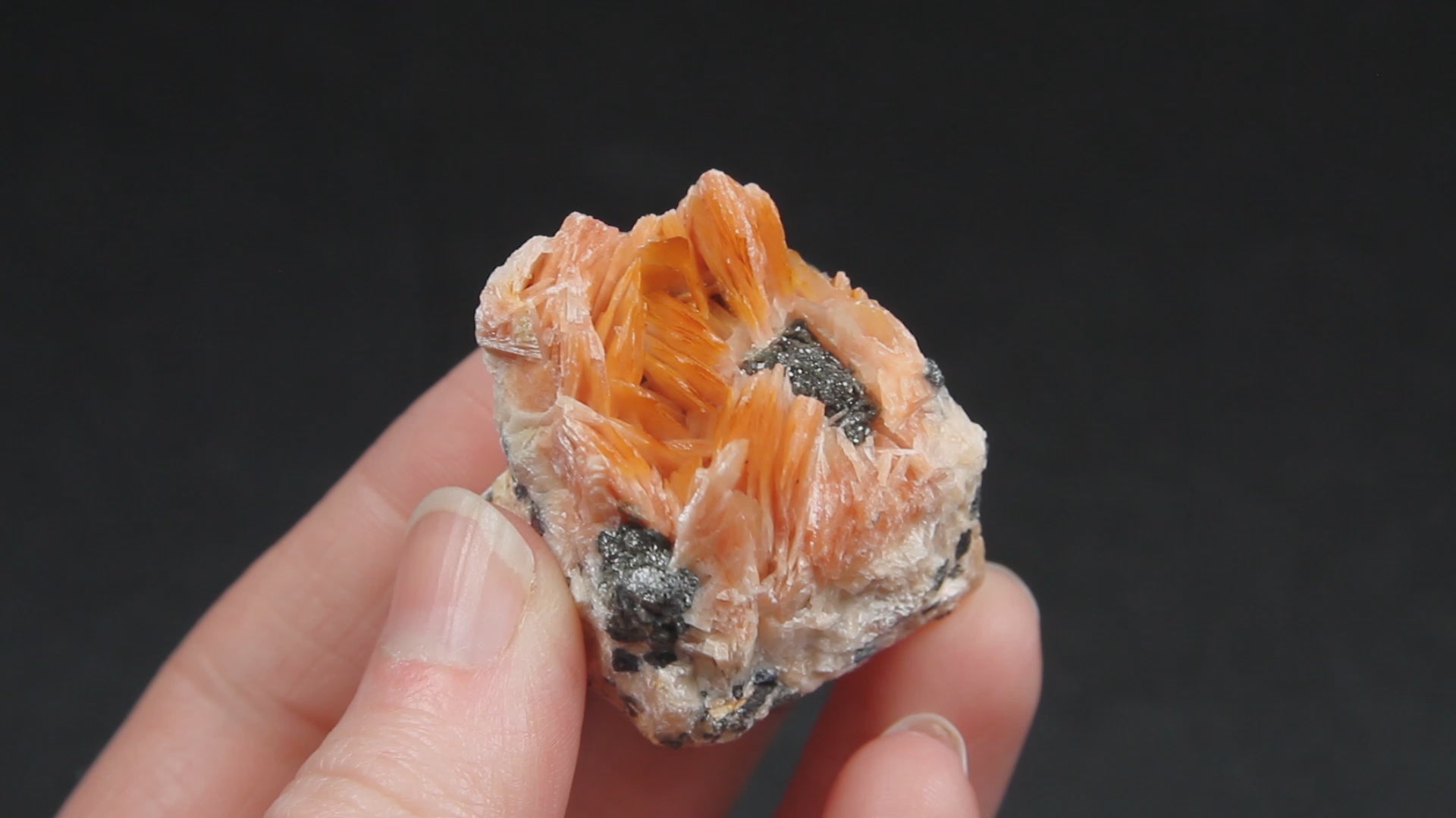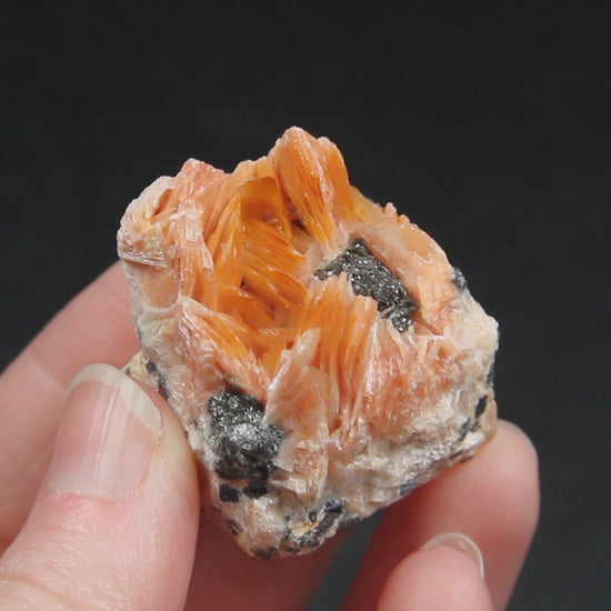 Pink-Orange barite with distinctive crystals arranged in clusters on matrix. A glistening cluster of fine cerussite sits between the blades, adding contrast to the specimen.