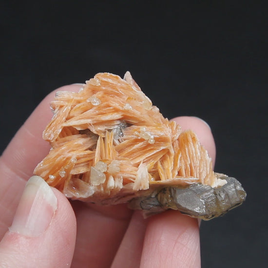 A stunning specimen featuring pink crystals of barite with cerussite crystals perched delicately along the blades, as well as a large cerussite crystal along one side of the specimen. A lovely combo of secondary minerals from Mibladen, Morocco.