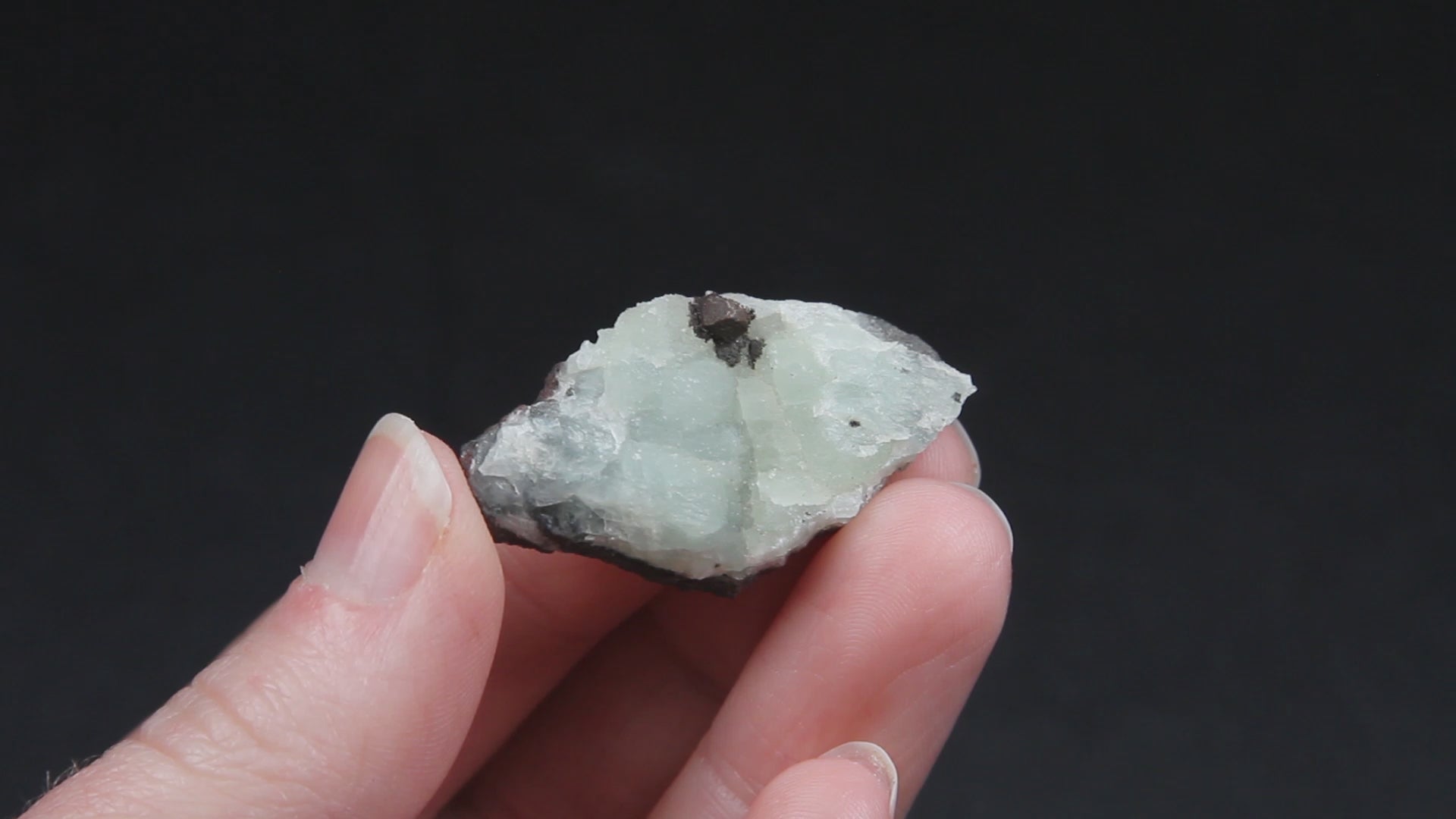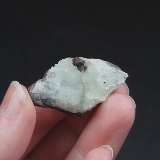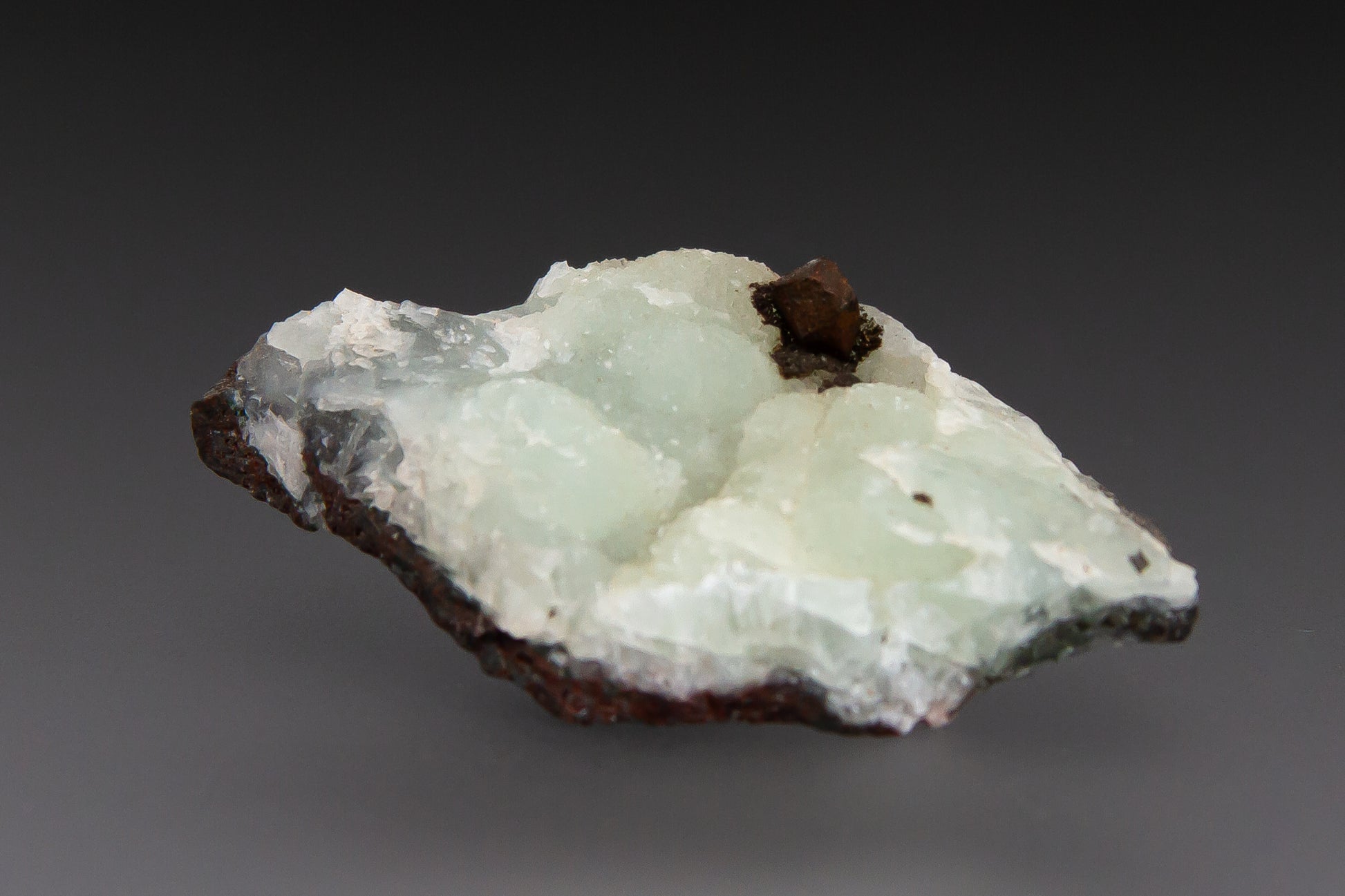 A lovely specimen of Michigan prehnite with a subtle sheen and light green coloration, accented with a small crystal of euhedral native copper. While copper is often found in association with minerals such as calcite, prehnite associations are far less common. This piece is a fantastic example of this unique Michigan pairing.