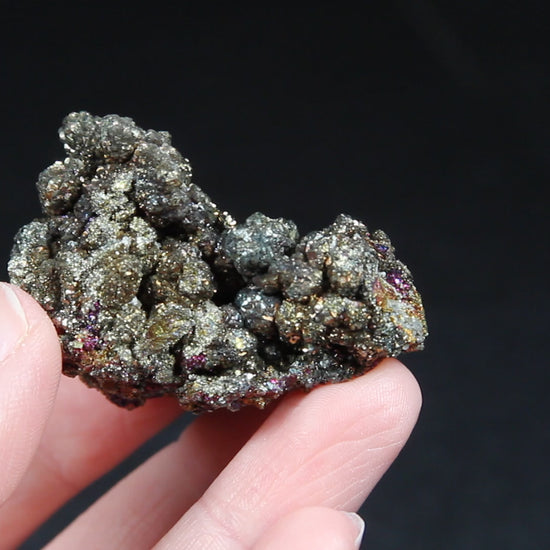 Stunning metallic crystalline spheres of chalcopyrite with a vibrant range of colors from brassy-gold to purple-pinks. This impressive specimen from Brushy Creek Mine in Missouri showcases excellent sculptural form and the iconic spherical shape that fine chalcopyrites form in.