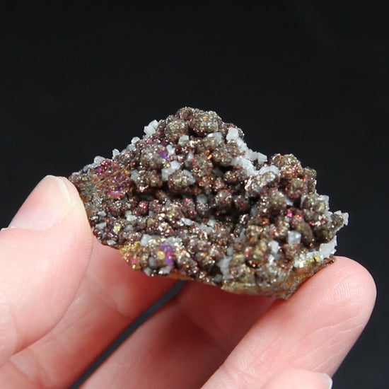 A sculptural cluster of chalcopyrite with natural iridescent tarnish—golden to magenta flashes—scattered across sparkling micro-quartz crystals. Sharp white dolomite rhombs are intergrown throughout, adding contrast and texture across the surface. Bright color, crisp dolomite faces, and good coverage on both sides make this a superb specimen for a metallic-focused collector, or anyone in need of more vibrant colors in their cabinet display.