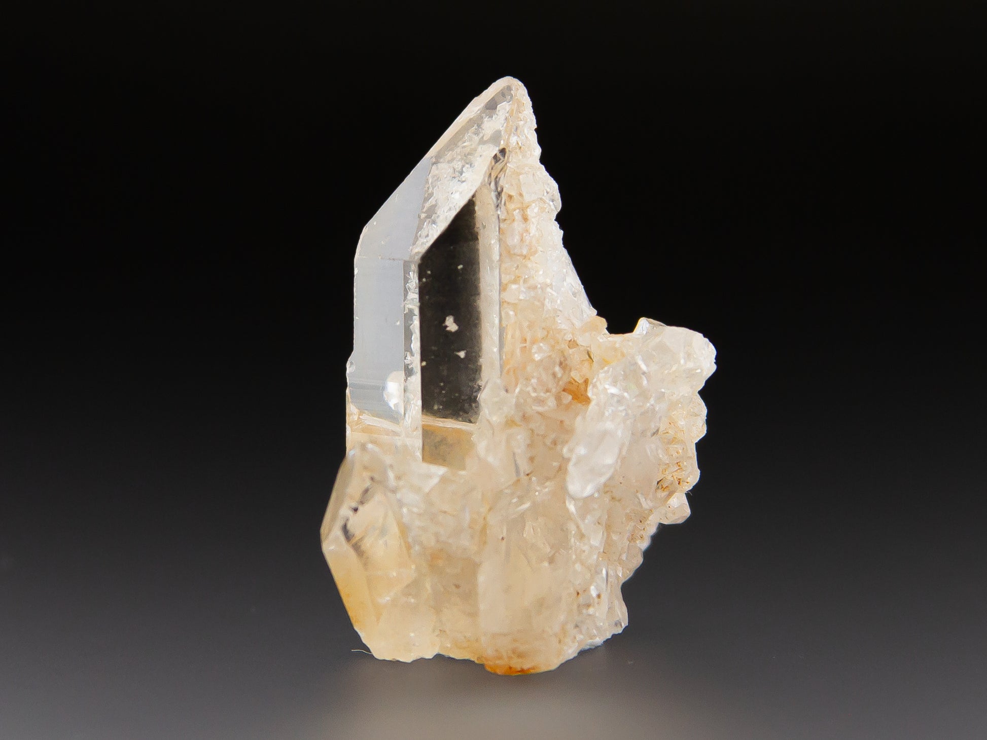 A well-formed quartz crystal from Arkansas, exhibiting sharp faces, good transparency, and strong vitreous luster. Secondary quartz crystals ascend along one prism face of the main crystal, with a cluster of additional crystals at the base. Minor edge contacts present throughout, with a small nick visible at the primary termination.