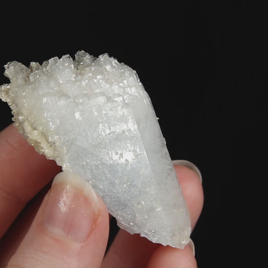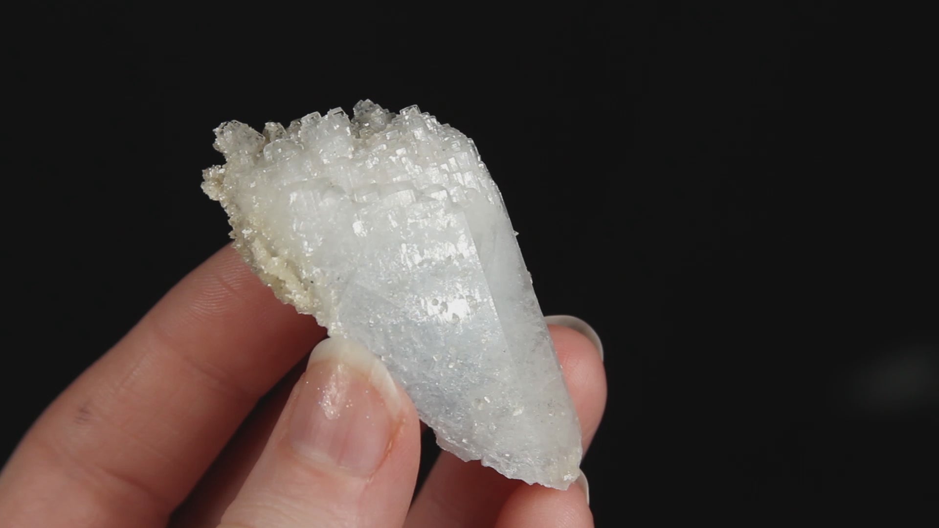 A superb celestine specimen from Sylvania Minerals Quarry, Michigan, exhibiting complex parallel growth with multiple aligned terminations along its length. The crystal shows sharp faces with excellent vitreous luster and is accompanied by secondary calcite growth on the reverse side. An outstanding example from this seldom-seen Michigan locality.