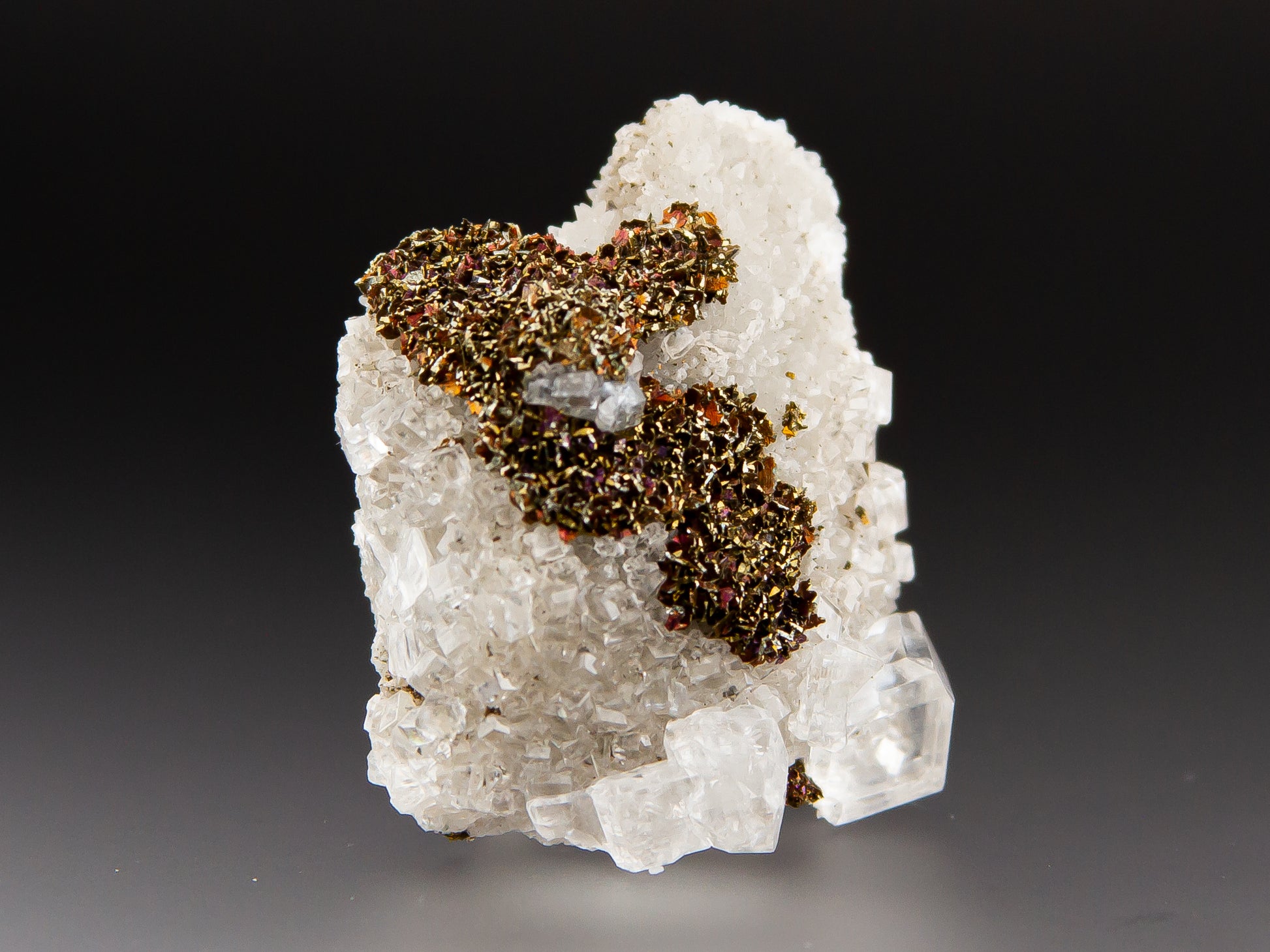 A quality association piece featuring calcite and marcasite from the Linwood Mine, Iowa. Gemmy, blocky calcite crystals display excellent vitreous luster and are aesthetically positioned alongside metallic marcasite showing typical iridescent tarnish colors. The specimen effectively demonstrates the distinctive crystal habits of both species from this renowned locality.