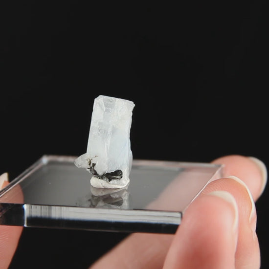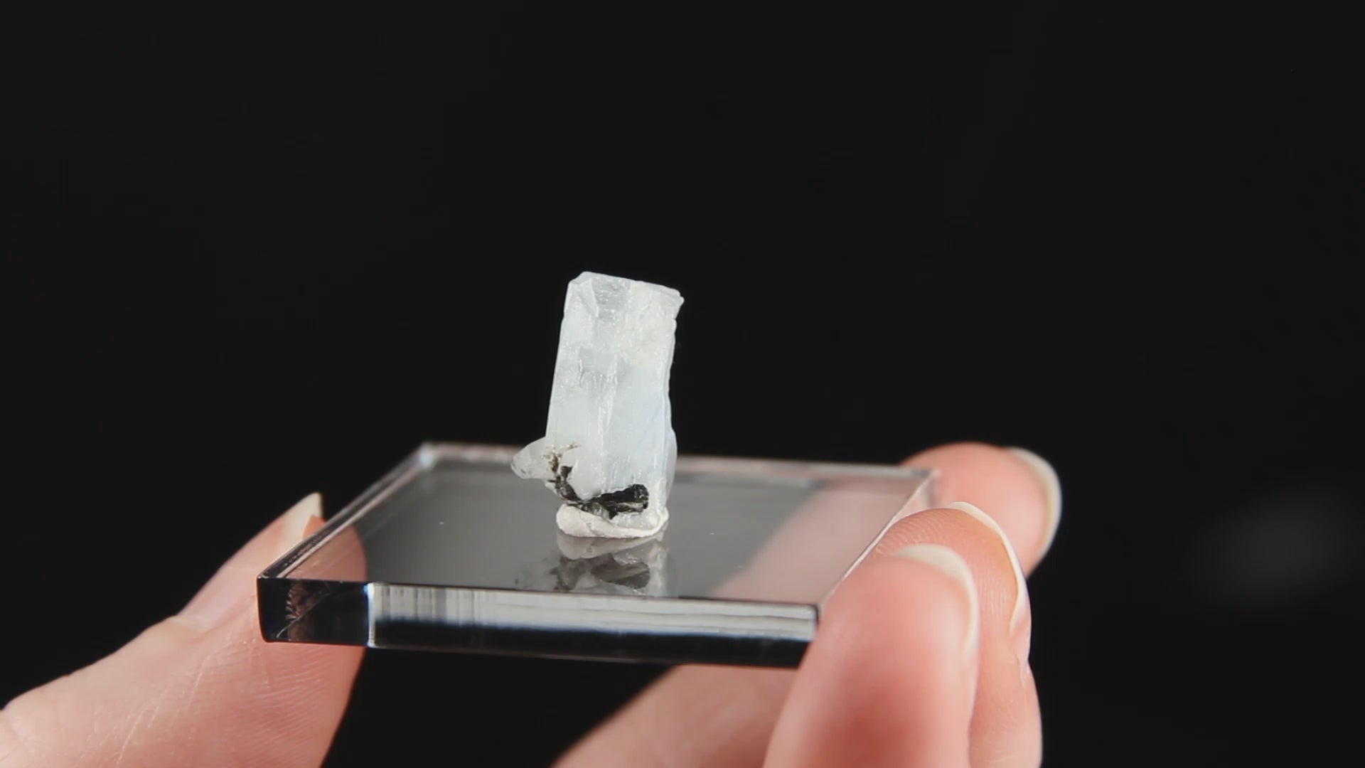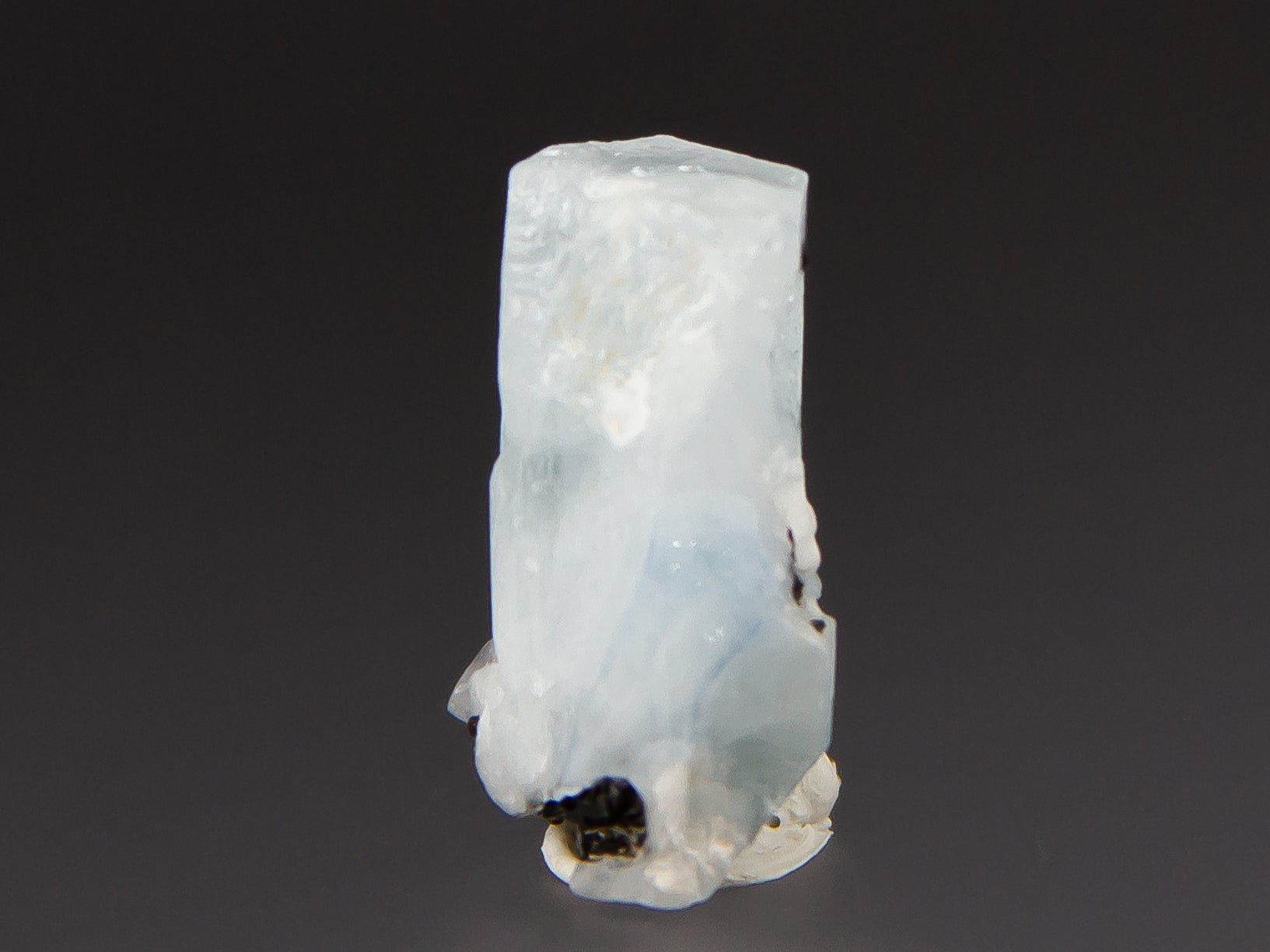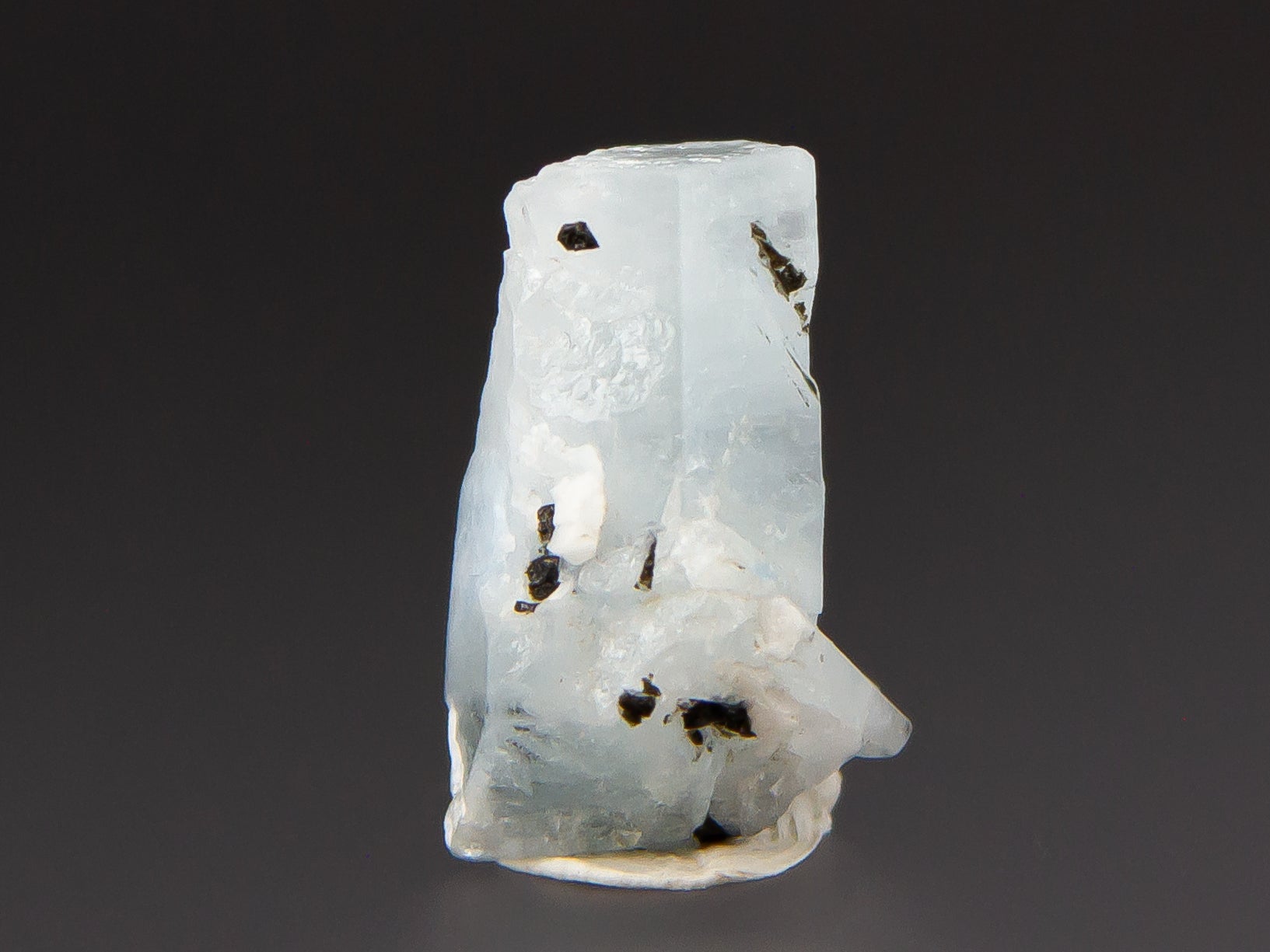 A lovely pale blue beryl gem of the aquamarine variety, with slight translucence and distinct hexagonal shape. Small black tourmaline crystals sit peaking out of the prismatic aquamarine adding appealing contrast. A great specimen from Skardu.