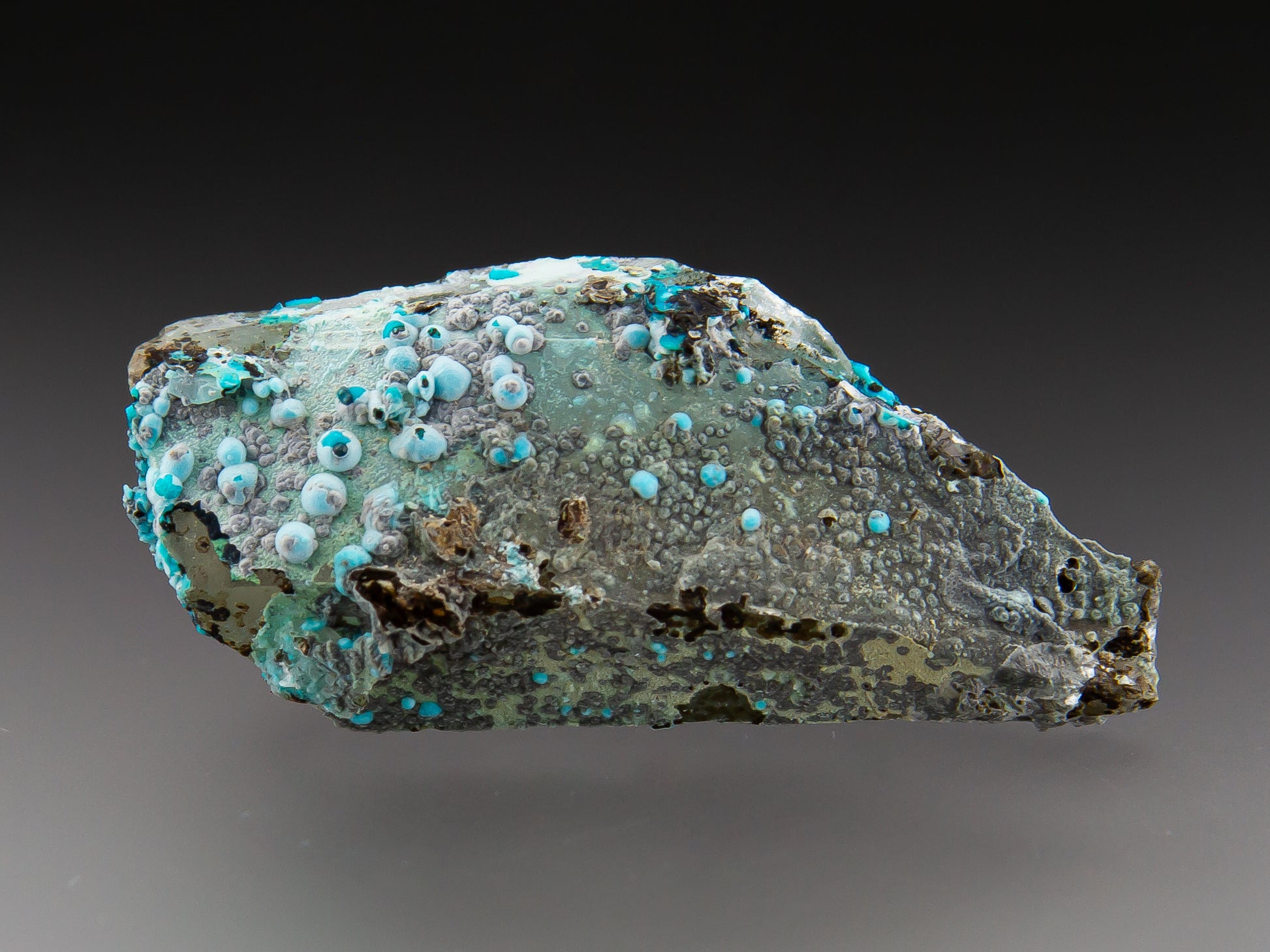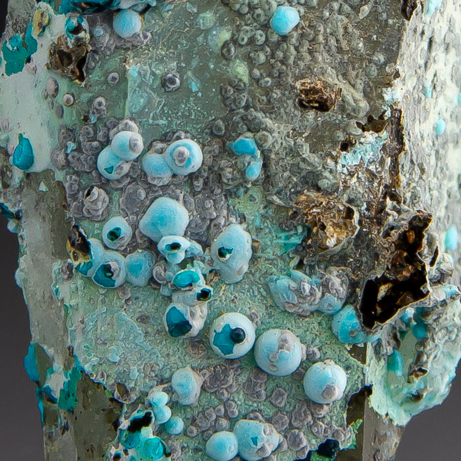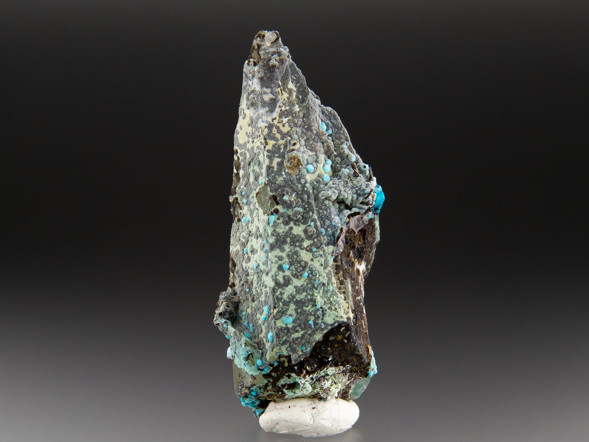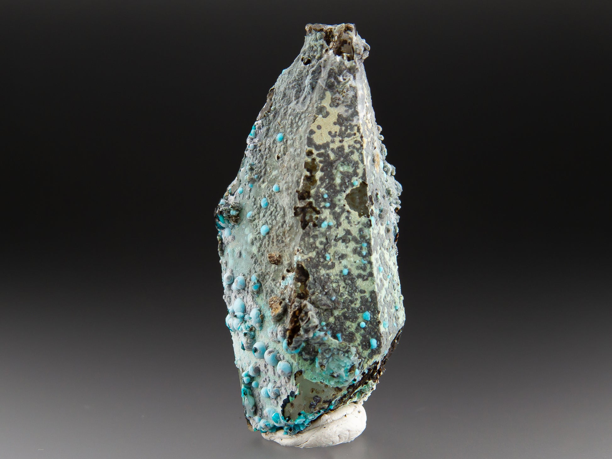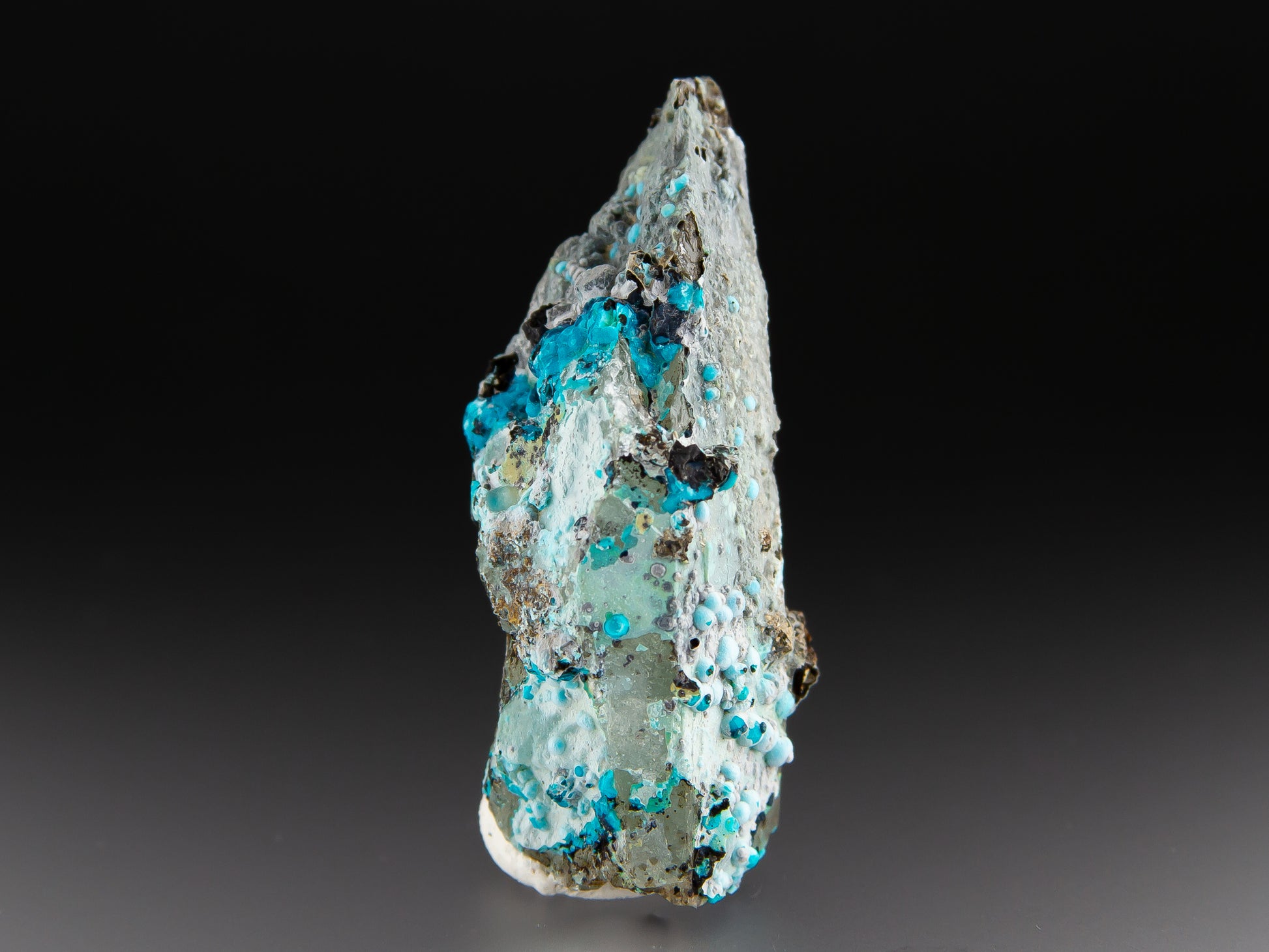 The Julcani Mining District of Peru sits atop a mineralogically rich volcanic complex that has yielded silver, copper, gold, and other materials since the 1940s. While silver remains the primary export from this region, collectors prize it equally for striking mineral specimens like this chrysocolla and quartz combination from the Tentadora Mine. Chrysocolla forms as a weathering product of copper-bearing minerals and frequently occurs alongside quartz and other copper oxides in these oxidized zones. This exquisite specimen presents a prismatic quartz crystal whose faces are decorated with scattered botryoidal chrysocolla formations in shades ranging from powder blue to rich turquoise. The chrysocolla appears in multiple growth stages, with a thin partial coating along the quartz surface, as well as numerous small, rounded bubbles and clusters that perch along the crystal's edges and surfaces.