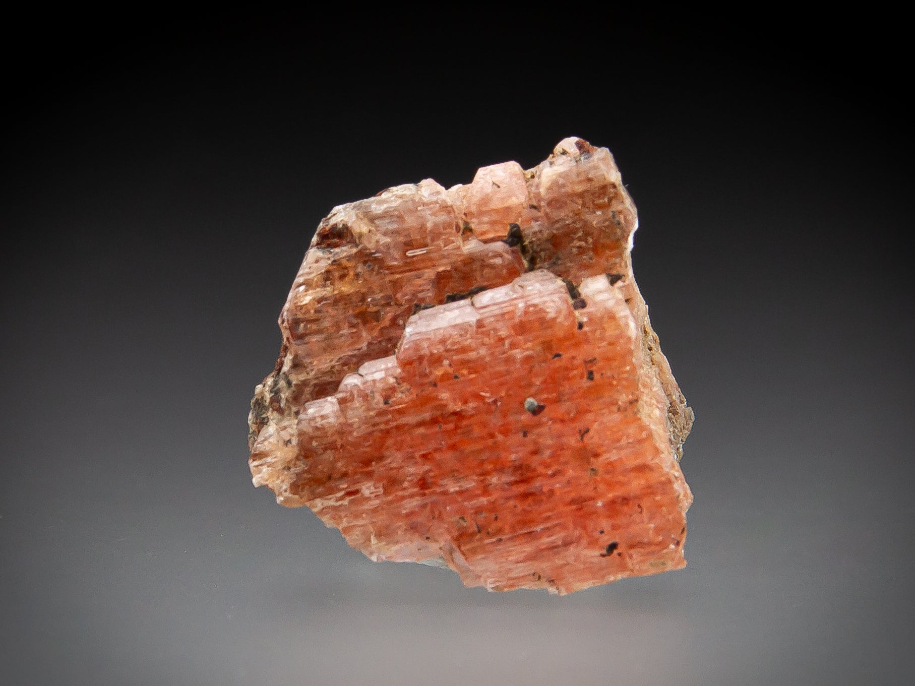 A superb serandite thumbnail specimen from the 1988 find in Poudrette Quarry. Fantastic in both color and luster, this specimen beautifully exemplifies why this particular serandite discovery is still hailed as the best of all-time to this day. The reflection of light off of its surface is intense and amplified my internal reflections from below the gemmy surface. This crystal displays the most intense color on the main face of the crystal, with the neighboring parallel-growth faces being slightly less saturated. The specimen is complete on one face, and is bounded by cleaved sides and back. This does not detract from its beauty, as the color and luster easily steals the show. A Poudrette Quarry classic, increasing in scarcity on the market!