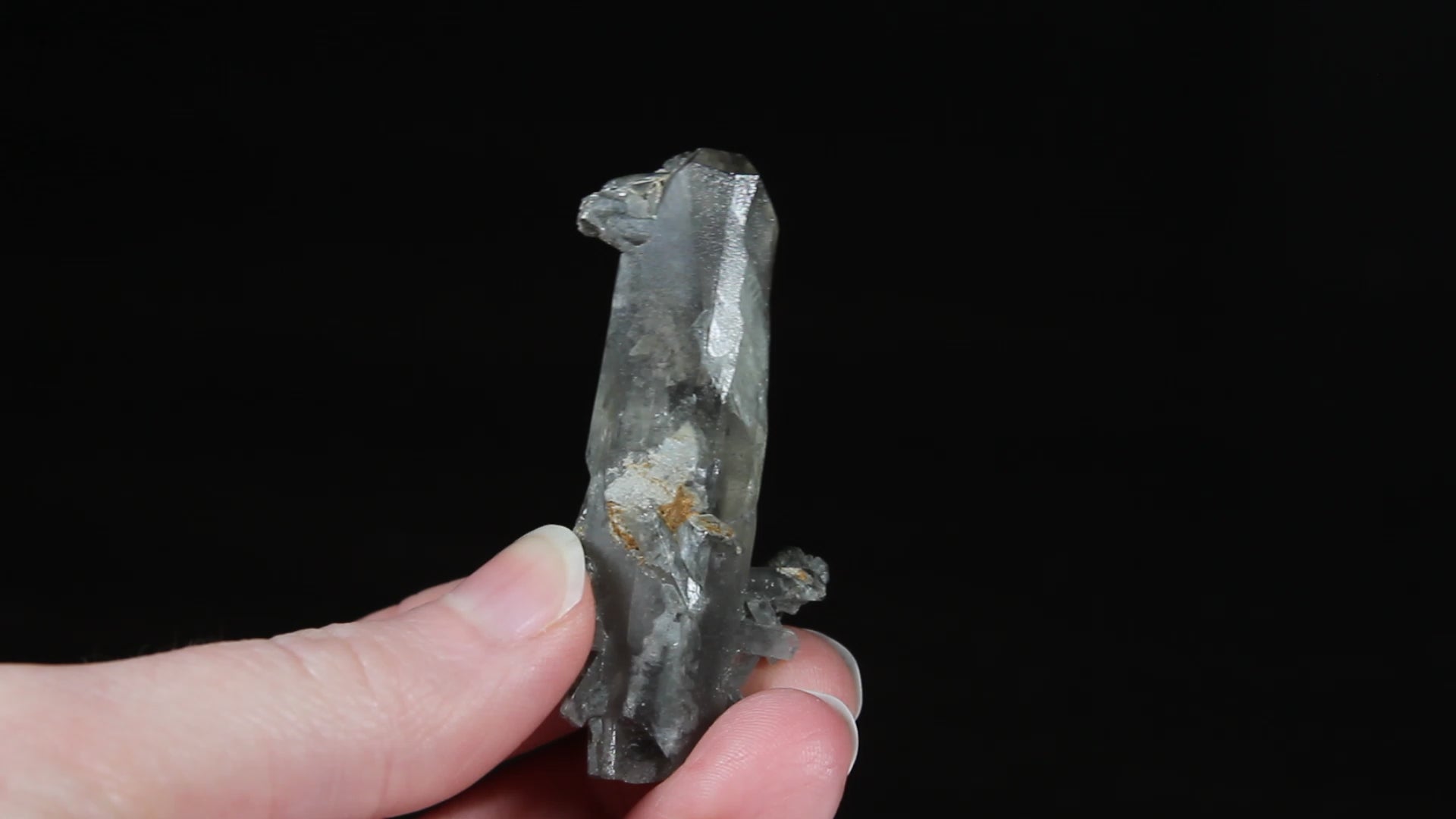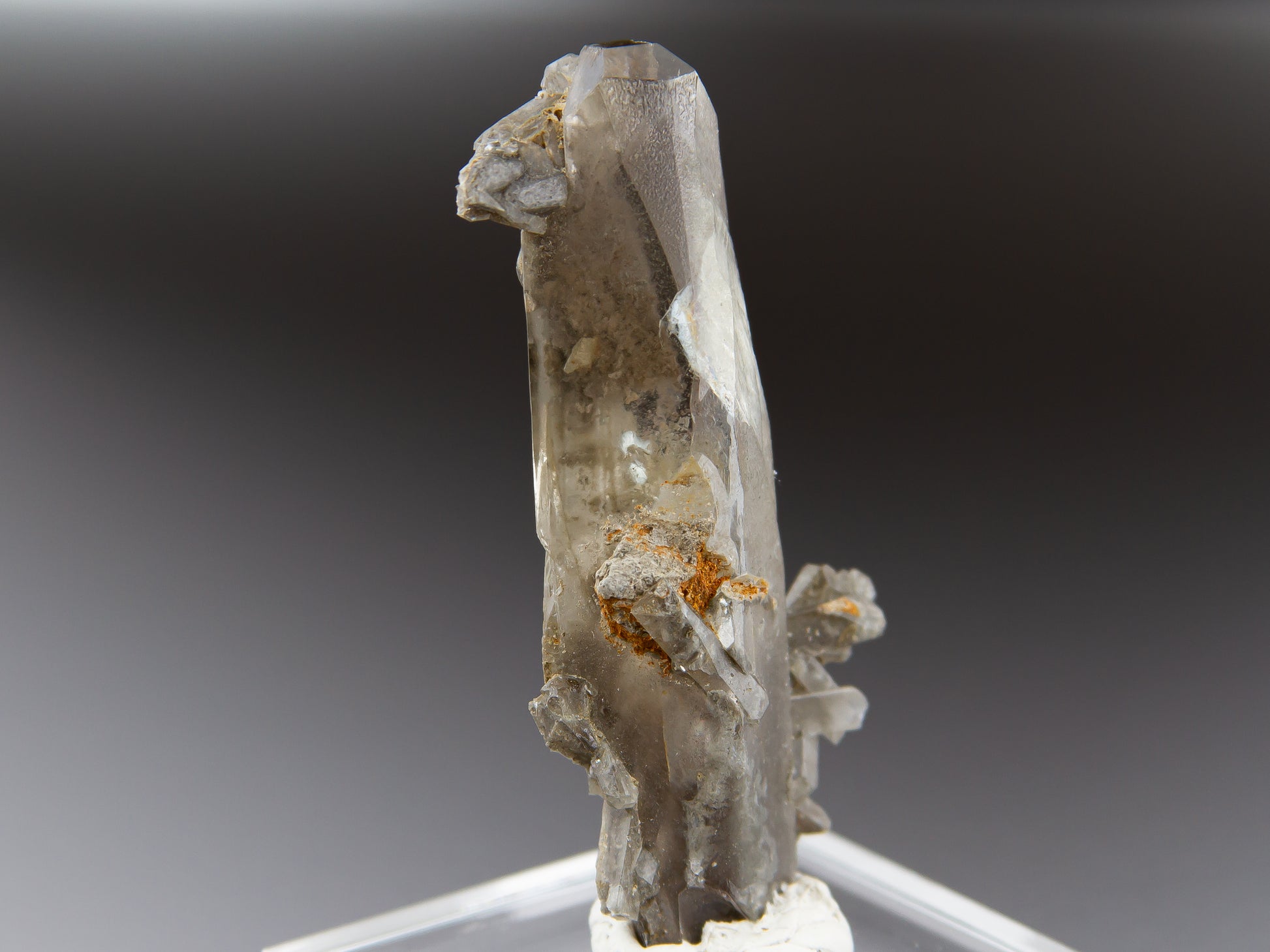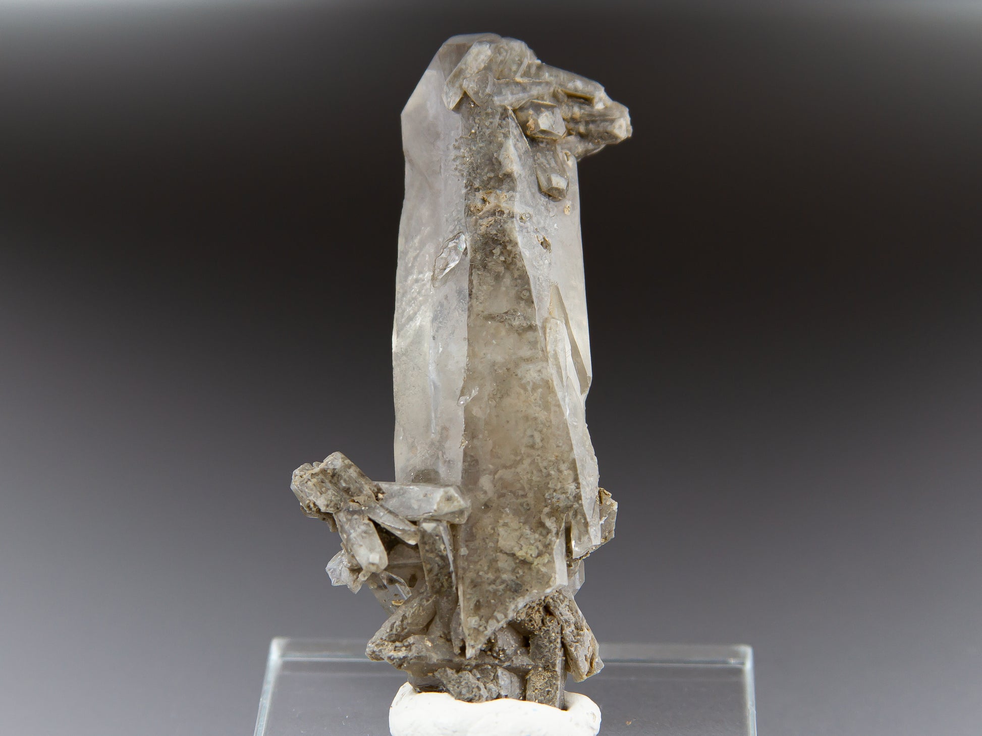A striking barite crystal from the Linwood Mine in Iowa, featuring an elongated form with a sharp chisel-tip termination. The main crystal displays an uncommon silvery hue—an attractive and less frequently seen color at this locality, where golden barite is more typical. Several small barite clusters rest along the prism faces as riders, adding subtle texture and complexity to the piece. A fine and well-composed example from this classic Midwestern locality.