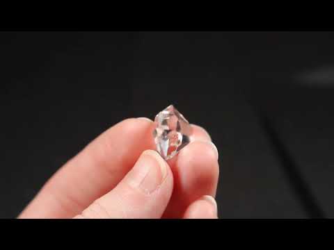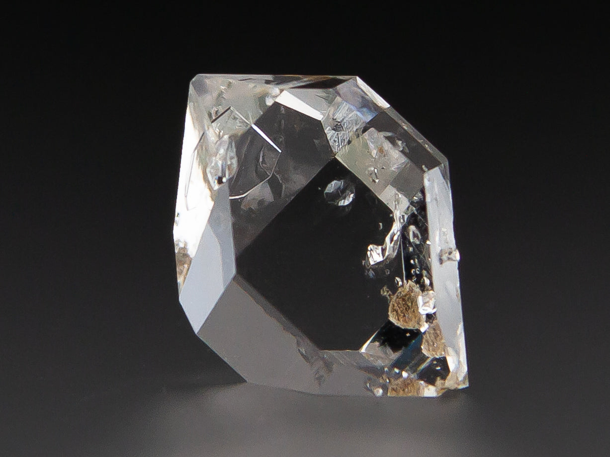 A water-clear, double-terminated Herkimer diamond from Herkimer County, New York. Along with its incredible clarity and natural double-terminations, this high quality gem has a somewhat tabular shape and a fantastic glassy luster, perfect for jewelry. A few small but intriguing voids can be seen through the crystal's faces. Aside from that, just a few contact blemishes are present on the surface of the stone, while one geometric-shaped indent sits upon an face of the crystal. Overall a fantastic crystal that well represents the famous New York quartz variety.