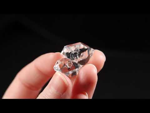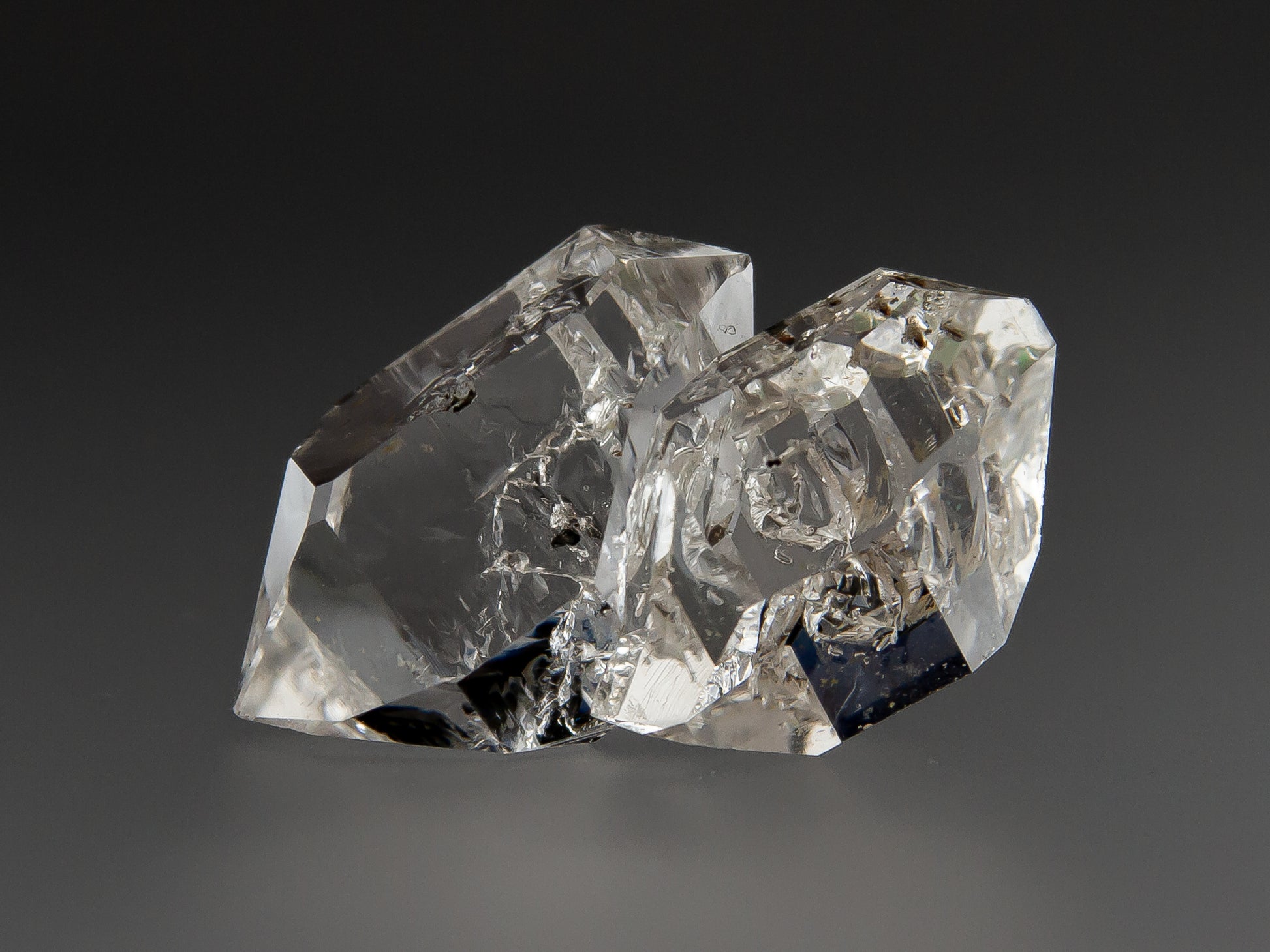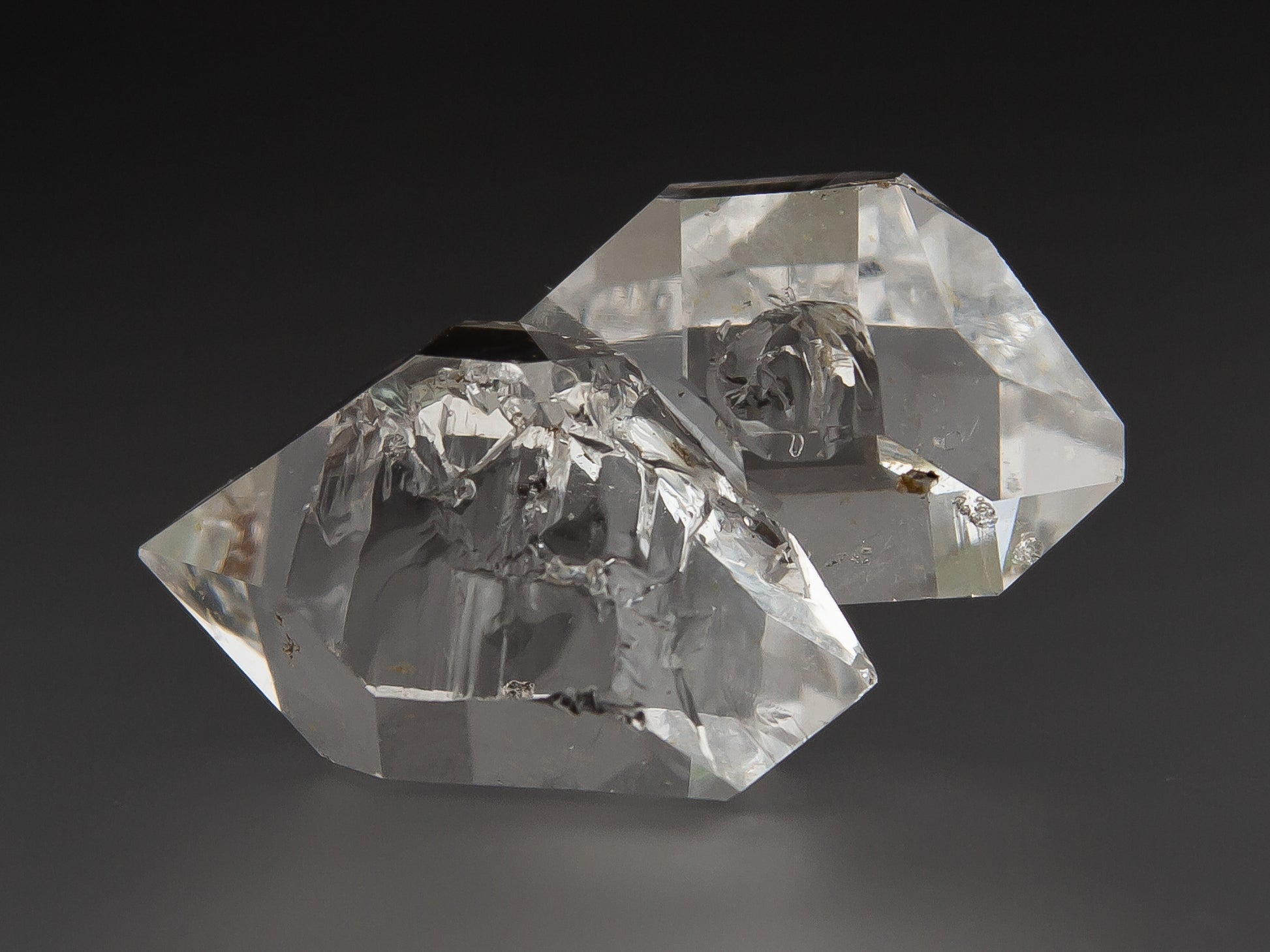 A beautiful Herkimer Diamond cluster specimen featuring two distinct doubly-terminated crystals situated nearly parallel to each other. One of the crystals is a bit larger than the other, with both displaying excellent clarity. From one viewing side of the specimen, the faces of the crystals are flat and glassy with few minor contact blemishes. On the reverse, some interesting growth patterns are present, as well as a smooth conchoidal fracture surface on part of one face of the larger crystal. Collected in April 2025.