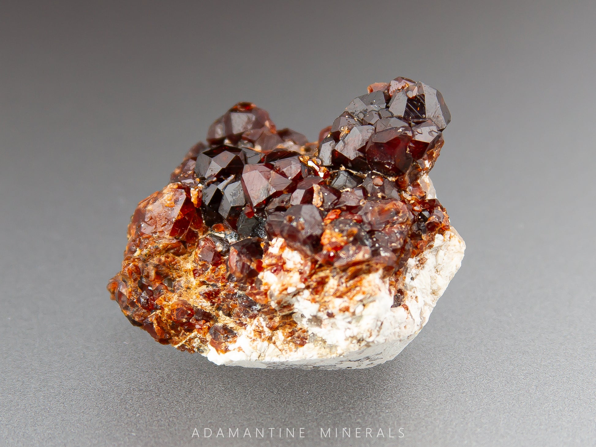 Beautiful and lustrous spessartine garnets out of the Wushan Spessartine Mine in Fujian Province, China. An attractive specimen featuring sharp, well-formed crystals with an adamantine luster. The garnets display a striking dark red-orange which appears nearly black until the crystals are illuminated. With production from Wu Mountain now strictly regulated, specimens from the locale have become increasingly scarce, making this an even more uncommon find.